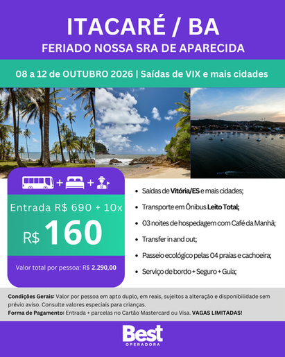 Sobre o destino: Itacaré faz parte de um cenário exuberante da Bahia e se destaca por apresentar muita história em contraste com a natureza, detalhes capazes de seduzir qualquer aventureiro. As construções da cidade são marcadas pelos casarões e igrejas recheados com o luxo baiano. Nos quesitos diversão, o destaque vai para os